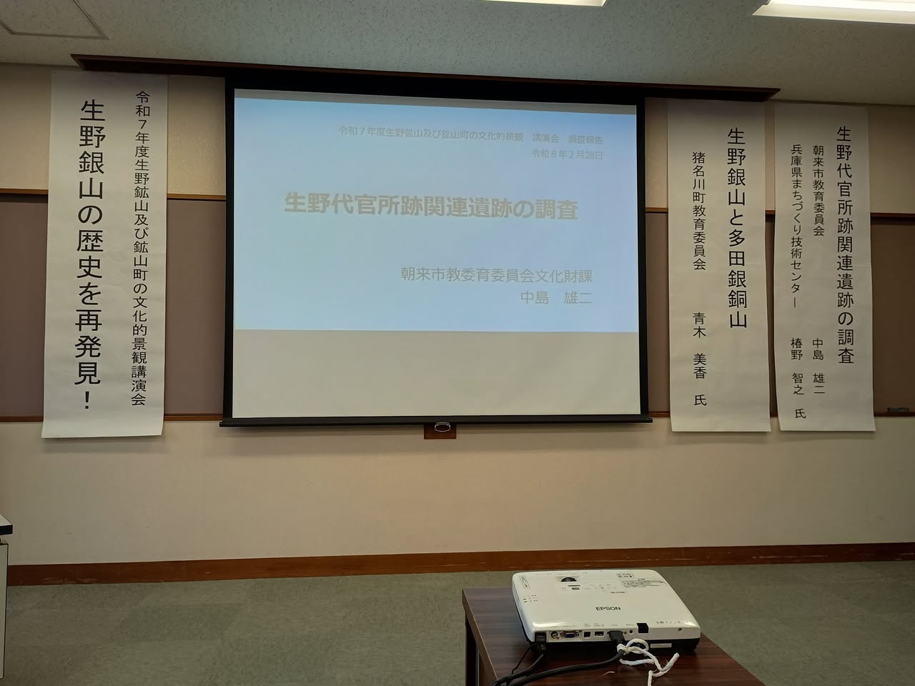 生野銀山の歴史を再発見する講座が開かれ、生野代官所関連遺跡の調査成果や、生野銀山と多田銀銅山の関わりについて、朝来市文化財課・兵庫県まちづくり技術センター埋蔵文化財調査部・猪名川町教育委員会教育振興課社会教育室の三名の講師からお話を伺いました。