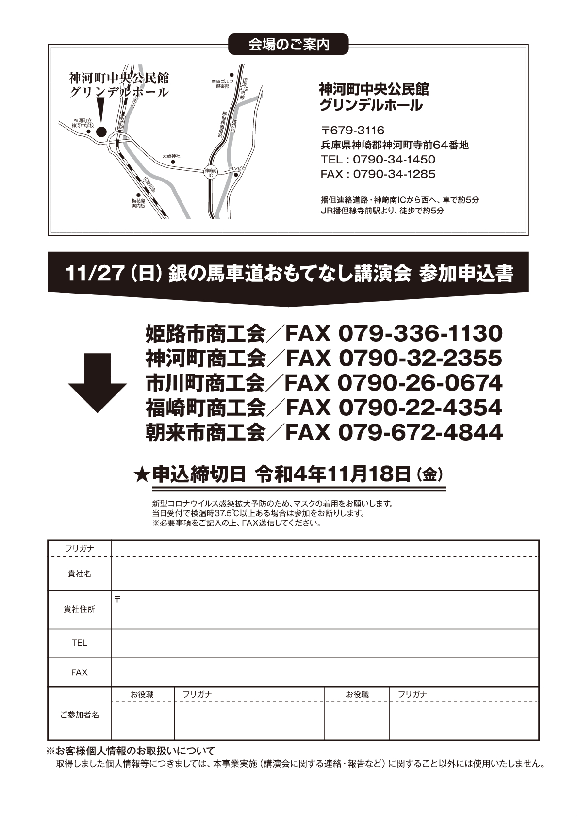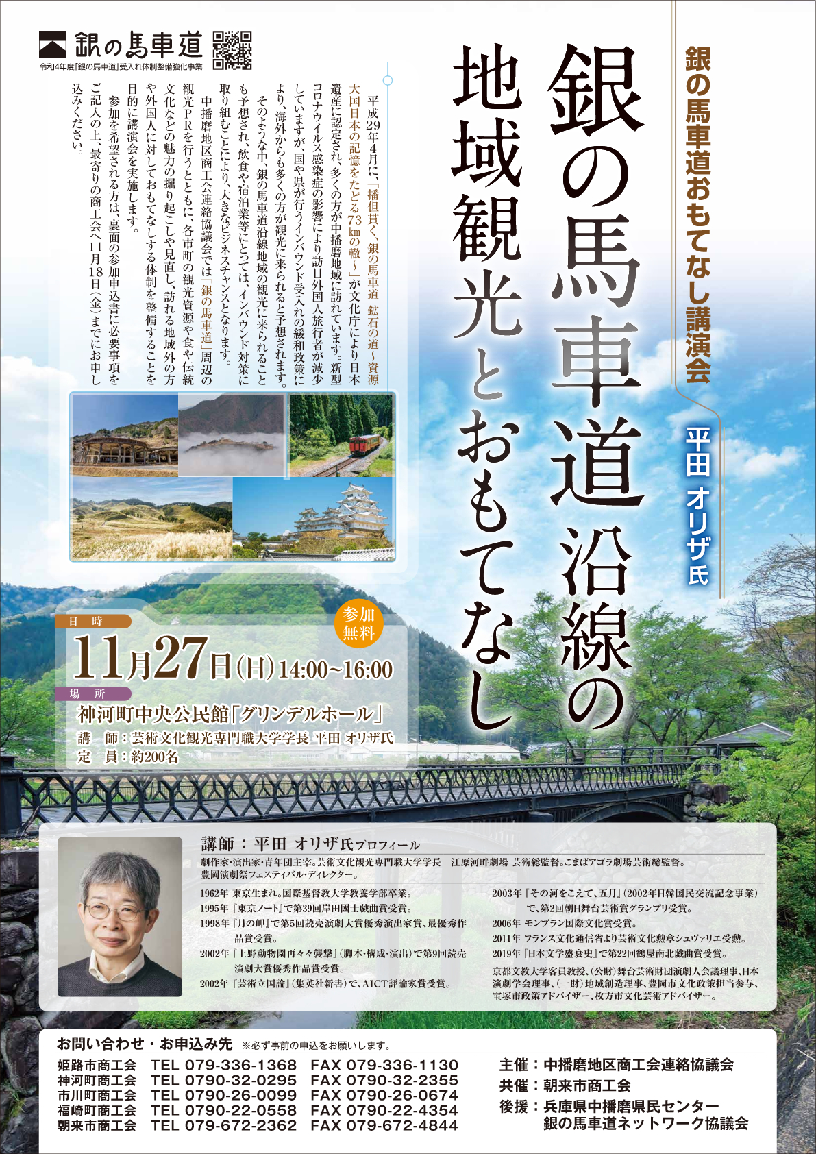 中播磨地区商工会連絡協議会では、「銀の馬車道」周辺の観光PRを行うとともに、各市町の観光資源や食や伝統文化などの魅力の掘り起こしや見直し、訪れる地域外の方や外国人に対しておもてなしする体制を整備することを目的に講演会を実施します。ぜひご参加下さい。