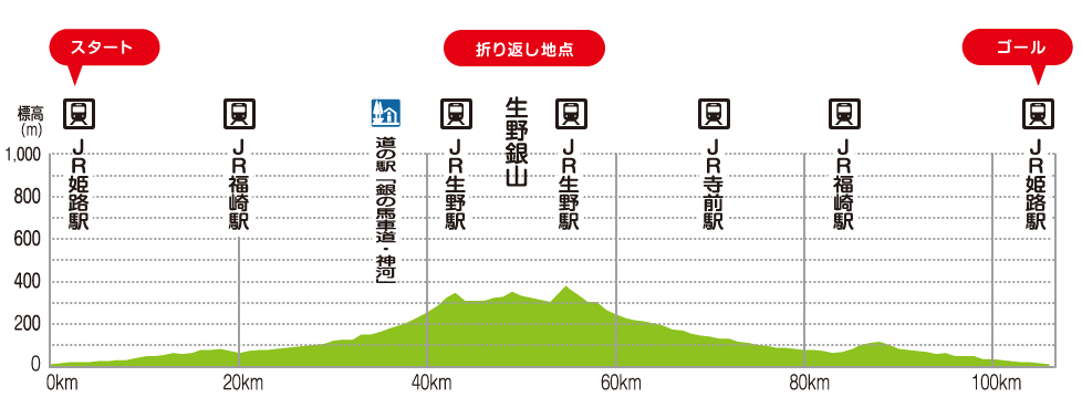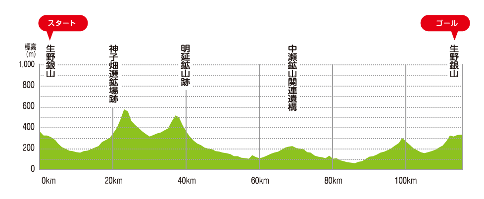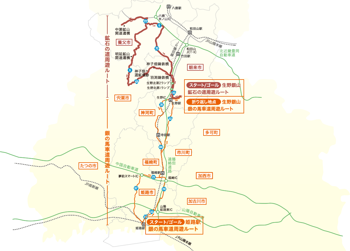 日本遺産「播但貫く、銀の馬車道 鉱石の道」を堪能できるルート全長222㎞のコースです。